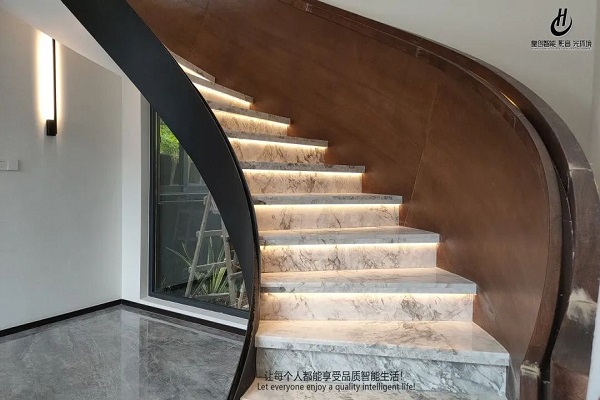 梯步感應燈帶更是本案例一大特色所在,一步一亮,跟著燈光逐步前行,自定義時間,緩和不刺眼的燈光,夜晚上下樓梯更保險;